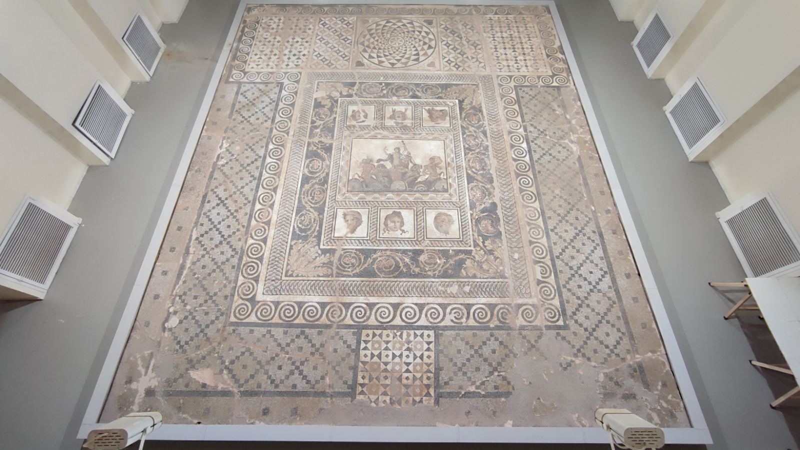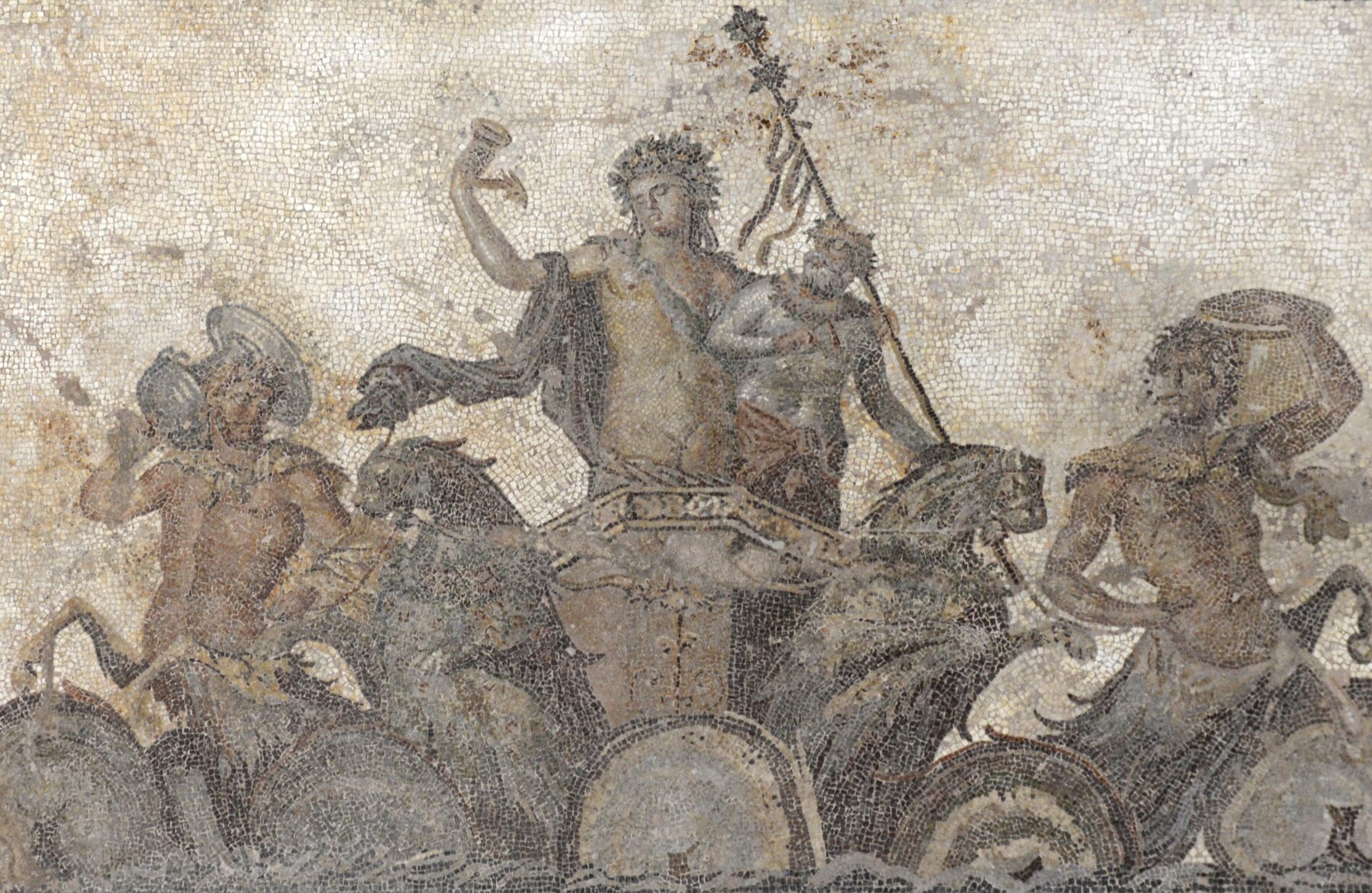 Στο κέντρο του ψηφιδωτού εικονίζεται μια εντυπωσιακή παράσταση του θεού Διονύσου επάνω σε άρμα που αναδύεται από τη θάλασσα. Ο θεός, που υποβαστάζεται από έναν Σάτυρο, κρατά στο δεξί χέρι ρυτό και στο αριστερό θύρσο (τελετουργικό ραβδί). Το άρμα σύρουν δύο ιχθυόγρυπες και δύο ιχθυοκένταυροι. Οι τελευταίοι που βρίσκονται στις δύο άκρες φέρουν στους ώμους πολυτελή αγγεία συμποσίου. Την κεντρική παράσταση πλαισιώνουν από την επάνω και την κάτω πλευρά έξι διάχωρα διατεταγμένα ανά τρία που εικονίζουν θεατρικά προσωπεία μορφών του διονυσιακού θιάσου.