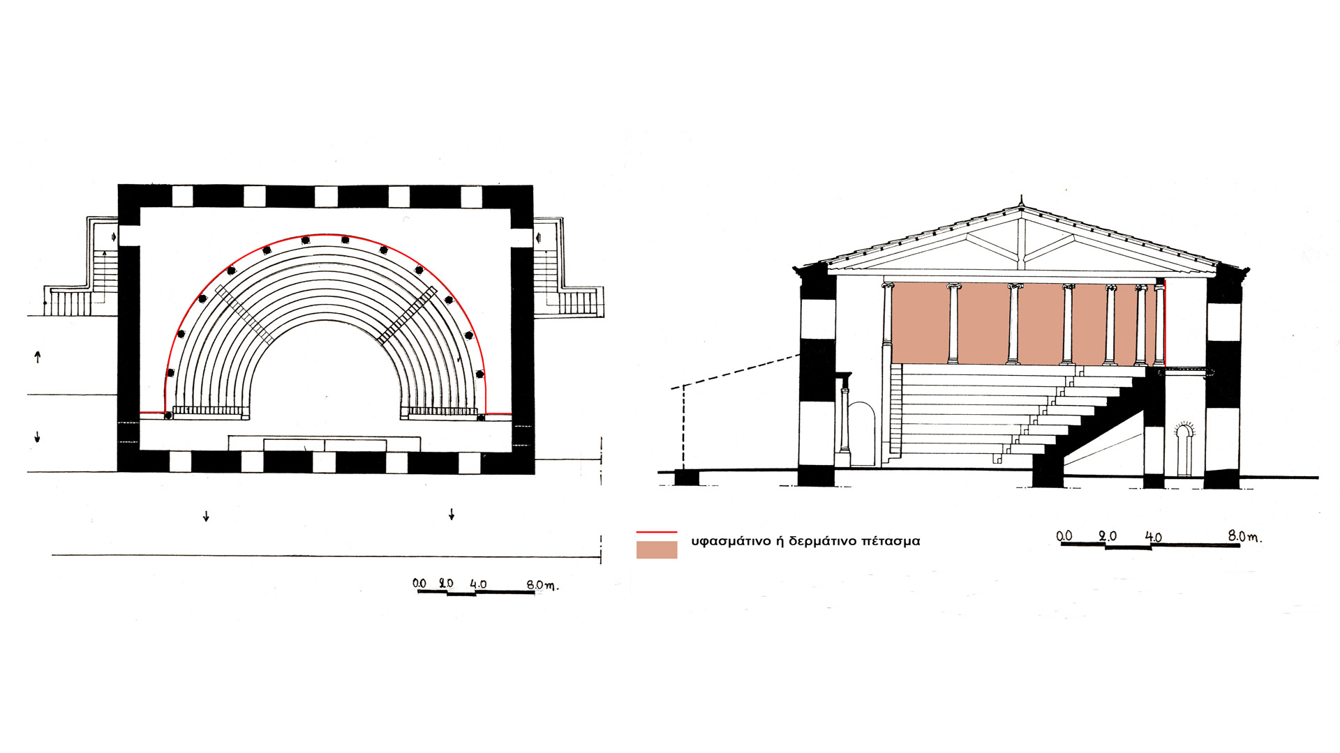 Η ελεύθερη κιονοστοιχία στην περίμετρο του κοίλου, η οποία αρχικά ερμηνεύθηκε ως μορφολογικό στοιχείο και ως βοηθητικό στοιχείο στήριξης της στέγης, έδινε επιπλέον τη δυνατότητα στήριξης συρόμενων υφασμάτινων πετασμάτων, τα οποία μετέτρεπαν, κατά βούληση, την αίθουσα από ορθογώνια σε ημικυκλική.