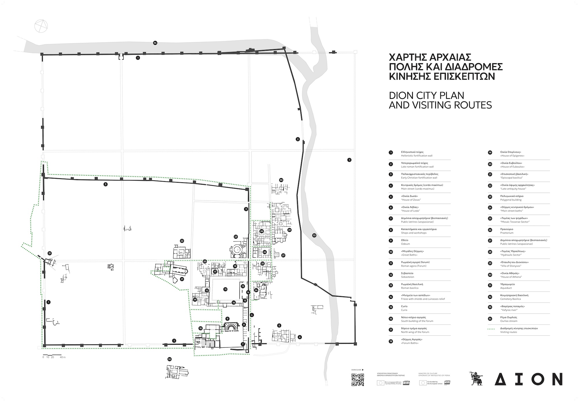 Την εποχή του Μακεδόνα βασιλιά Κασσάνδρου, στα τέλη του 4ου – αρχές του 3ου αι. π.Χ., το Δίον οχυρώθηκε μ’ ένα μνημειακό τείχος μήκους 2.625μ., που περιέκλειε έκταση 430 στρεμμάτων, οργανώθηκε πολεοδομικά βάσει του ιπποδάμειου συστήματος και επιπλέον απέκτησε δημόσια κτήρια μνημειακού χαρακτήρα. Τον 1οαι. π.Χ. μετατράπηκε σε ρωμαϊκή αποικία με το όνομα Colonia Iulia Augusta Diensis. Αργότερα, κατά την ύστερη ρωμαϊκή εποχή, εφαρμόστηκε στο Δίον ένα εκτεταμένο οικοδομικό πρόγραμμα, στο πλαίσιο του οποίου ανανεώθηκαν οι δημόσιοι χώροι της πόλης και νέα μνημειακά συγκροτήματα προστέθηκαν στο δυναμικό της: κτήρια δημόσιου και εμπορικού χαρακτήρα, όπως η ρωμαϊκή αγορά (το forum), δημόσια λουτρά (θέρμες), καταστήματα, ωδείο, δημόσια αποχωρητήρια, καταλύματα για κρατικούς αξιωματούχους καθώς και ξενώνες.