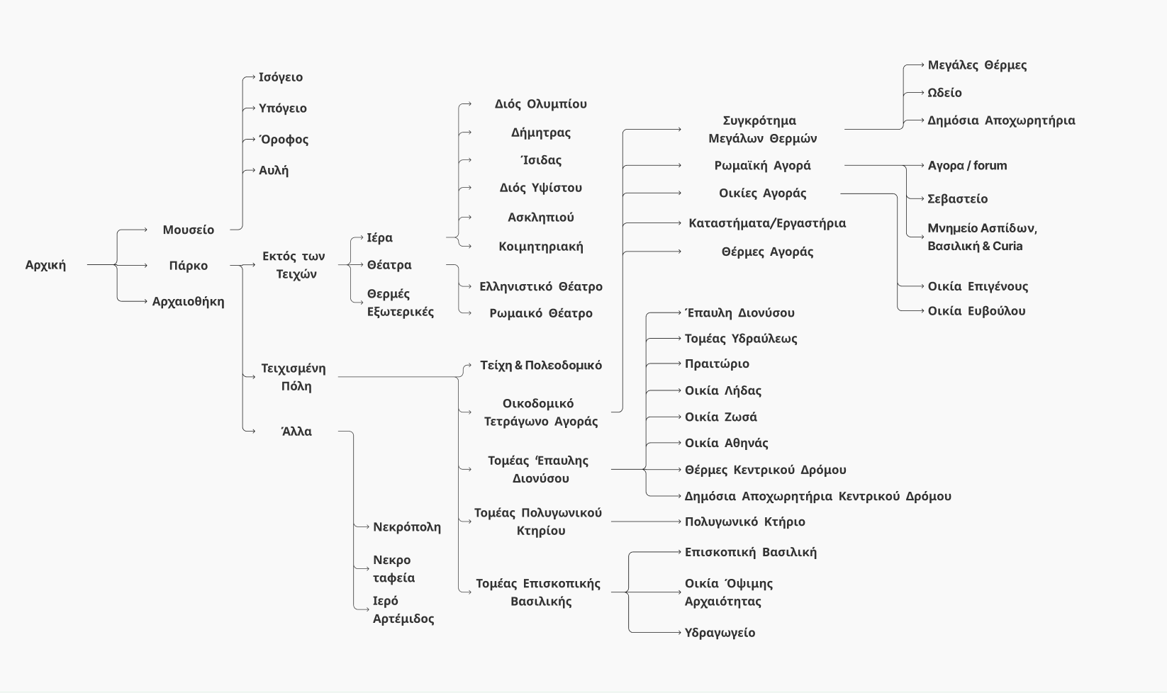 Το επισκέψιμο αρχαιολογικό πάρκο περιλαμβάνει δύο διακριτά μεταξύ τους τμήματα: την περιοχή των αρχαίων ιερών στα νότια και την τειχισμένη πόλη στα βόρεια.