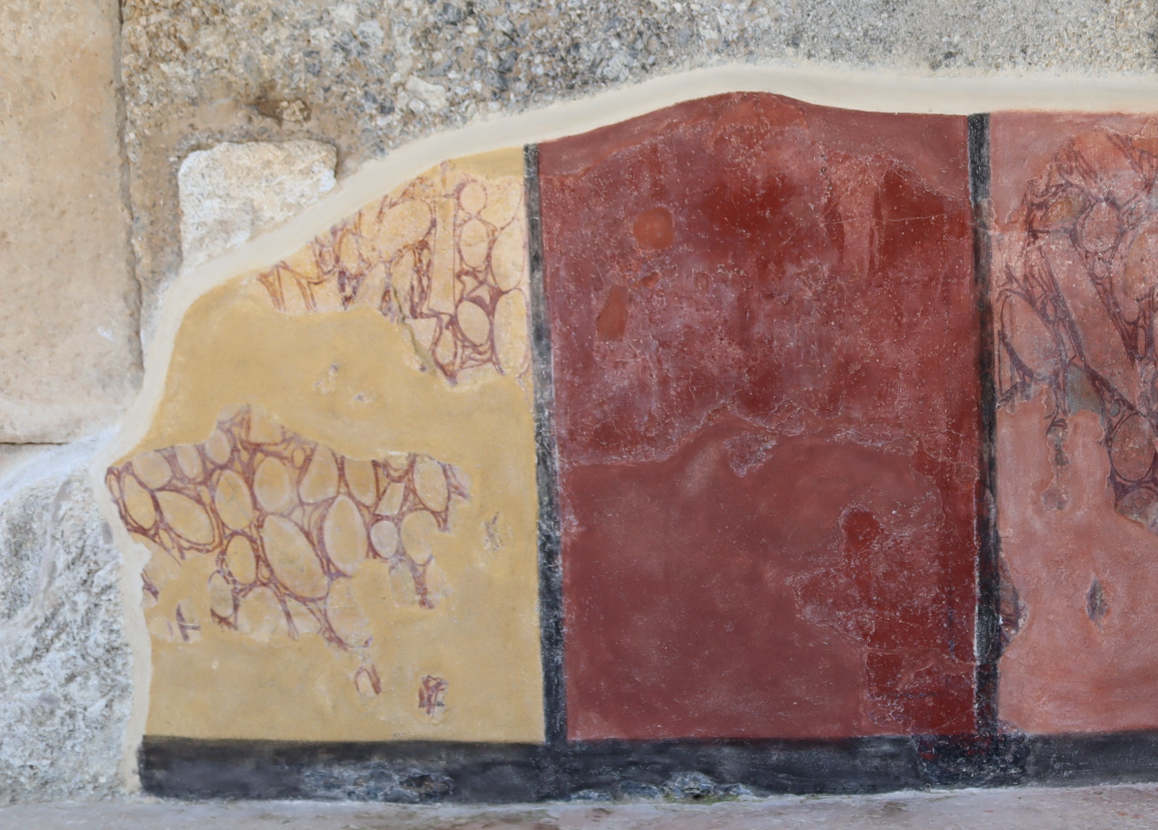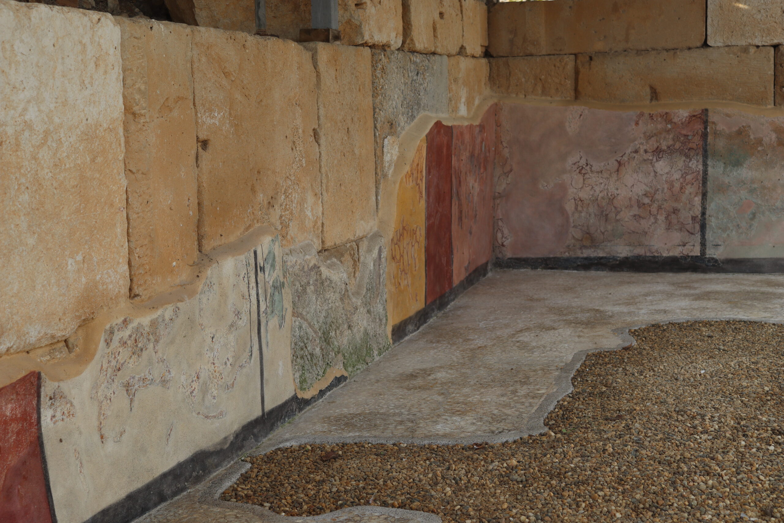 Οι τοίχοι του κτηρίου κοσμούνταν με τοιχογραφικό διάκοσμο που μιμείται έγχρωμη ορθομαρμάρωση (διακοσμητική επένδυση του τοίχου με μάρμαρο) και σώζεται στις δύο γωνίες του κτηρίου. Η τοιχογραφία αποτελείται από εναλλασσόμενους πίνακες διαφορετικού μεγέθους και χρωμάτων (κόκκινο, πράσινο, καστανό, ώχρα) πλαισιωμένους από μαύρες ταινίες.